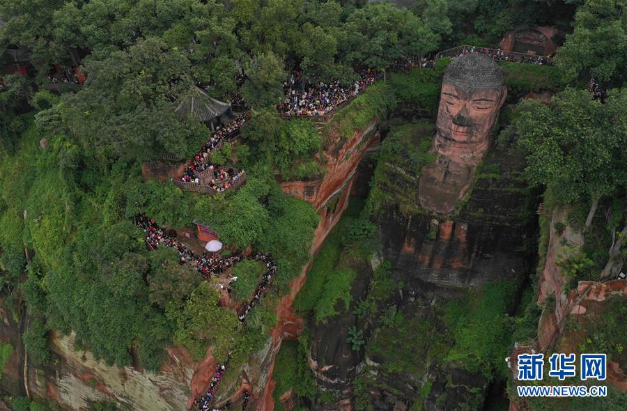 10月4日,游客在樂山大佛景區(qū)的棧道上有序排隊(duì),一睹大佛真容(無人機(jī)拍攝)。
