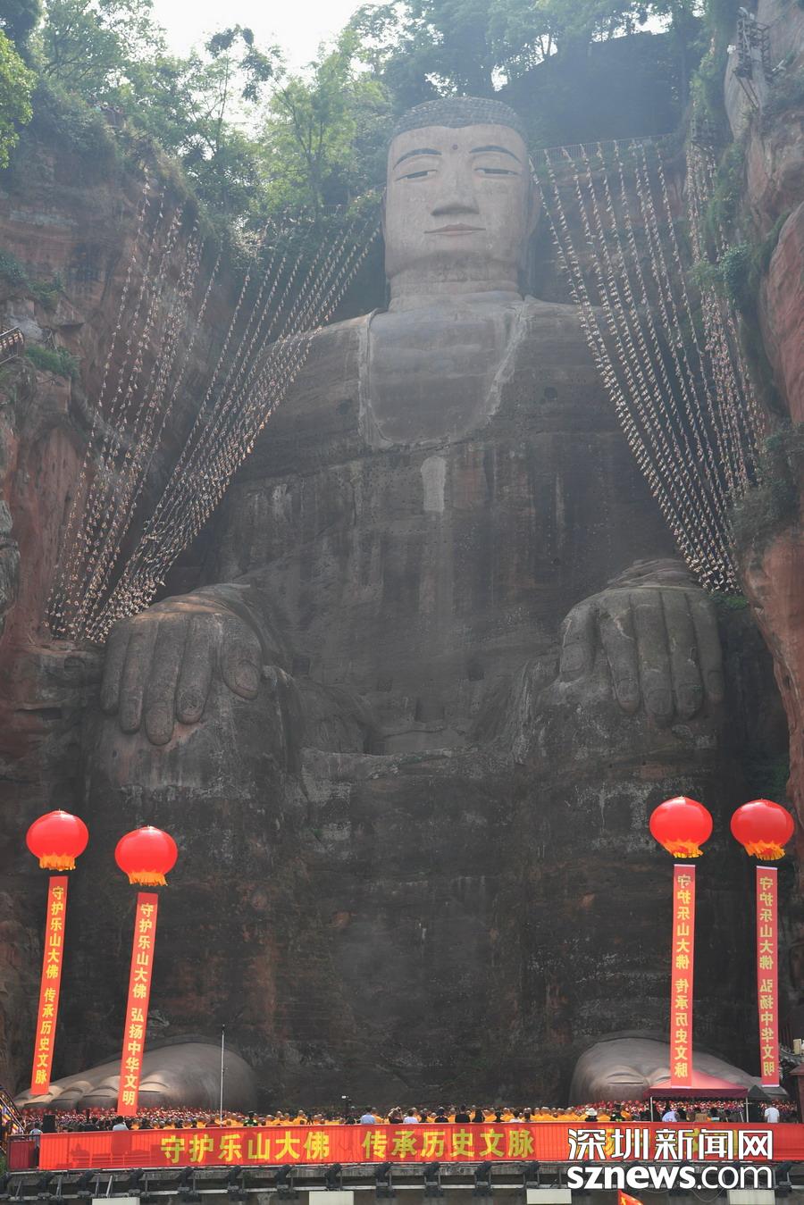 2019年4月26日,四川樂山,樂山大佛經(jīng)過閉關(guān)“體檢”、美容保養(yǎng)及智能監(jiān)測等環(huán)節(jié)后,胸腹部開裂險情排除,生物病害得到有效控制,大佛正式出關(guān)。
