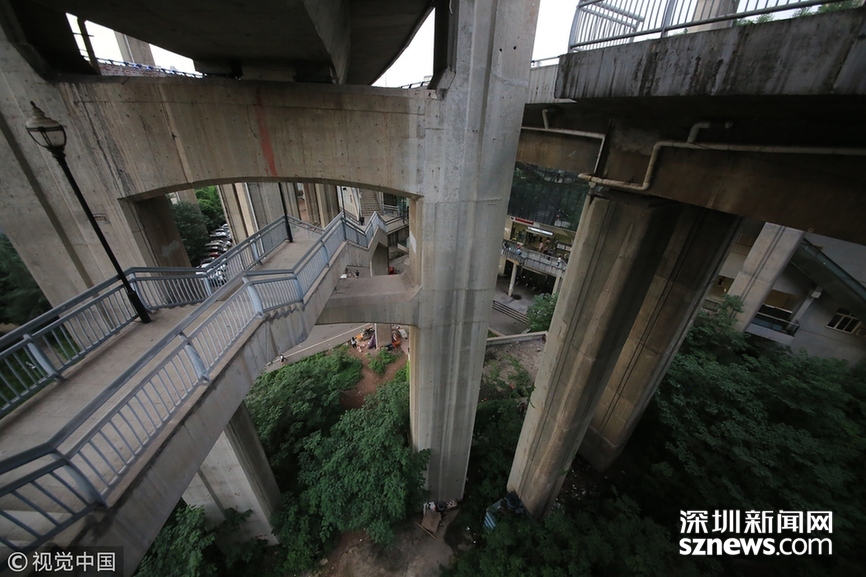 2018年5月29日,重慶,魔幻重慶又雙叒叕放大招!還有一個獨特的亮點,重慶軌道交通3號線銅元局站,出口由一段長梯銜接上方立交橋和下方的路面,與全國最高城市立交橋蘇家壩立交組成了獨特風(fēng)景,許多游客專門趕來拍照。