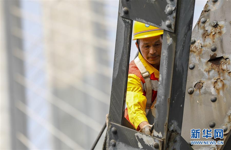 中國鐵路成都局有限公司重慶工務(wù)段53歲的橋隧工唐金華在白沙沱長江大橋的鋼架上檢查鋼梁的銹蝕情況(4月23日攝)。 4月23日下午5點(diǎn)40分,隨著重慶白沙沱長江大橋通行的最后一列客運(yùn)列車順利通過,這座“服役”了59年的重慶首座長江大橋進(jìn)入“退役”倒計時。4月24日后,所有列車將改線經(jīng)距白沙沱長江大橋約100米的新白沙沱長江特大橋通行,新橋“接力”老橋,運(yùn)輸能力將得到大幅提升。 白沙沱長江大橋于1958年開工,1960年通過首趟列車,是繼武漢長江大橋之后的第二座長江大橋。 新華社記者 劉潺 攝
