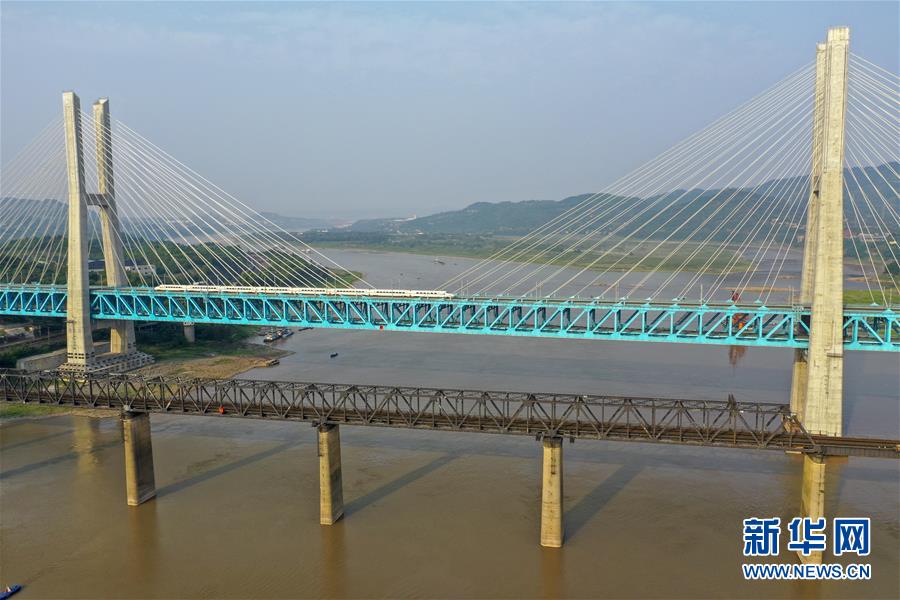 新白沙沱長江特大橋在老橋下游100米左右位置跨越長江,全長約5.3公里,為上下兩層六線鐵路橋,上層為四線鐵路客運(yùn)專線,2018年1月25日隨著渝貴鐵路通車正式投入運(yùn)營。該橋是渝貴鐵路全線規(guī)模最大、技術(shù)最為復(fù)雜的控制性工程,是世界上首座六線鐵路鋼桁梁斜拉橋,也是世界上每延米載荷量最大的橋梁,同時也是世界上首座雙層鐵路鋼桁梁斜拉橋。