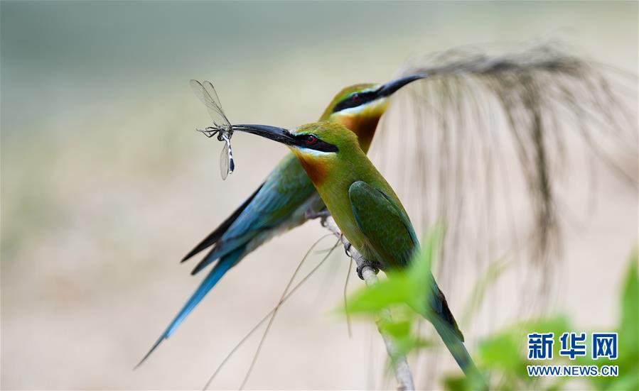 5月14日,栗喉蜂虎在枝頭進(jìn)食。 新華社記者 楊冠宇 攝