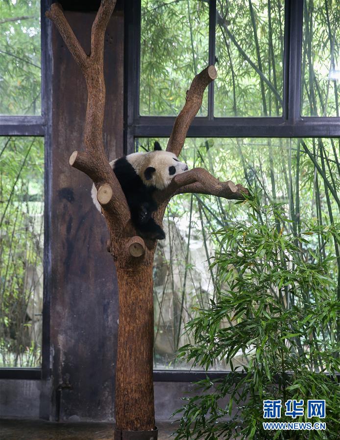 6月1日,在上海野生動物園,大熊貓寶寶“七七”在樹上休息。當(dāng)日,上海野生動物園舉行命名儀式,宣布一只10個月大的大熊貓寶寶被正式命名為“七七”。新華社記者丁汀攝