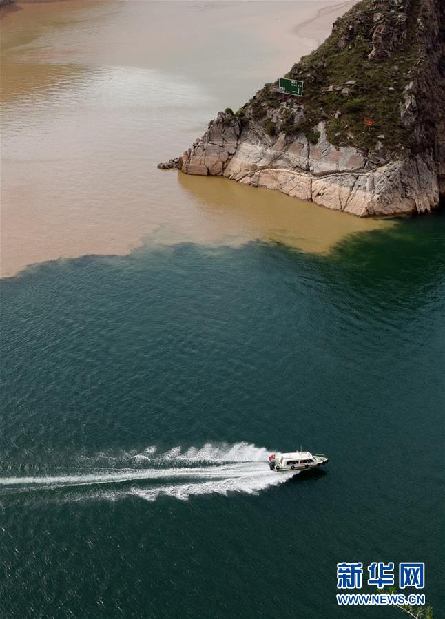 10月24日,一艘快艇從劉家峽水庫(kù)庫(kù)區(qū)的洮河與黃河交匯處駛過(guò)(無(wú)人機(jī)拍攝)。 新華社記者 陳斌 攝