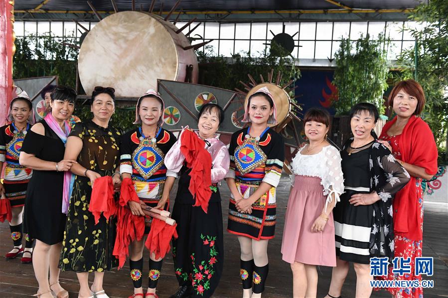 游客與基諾族大鼓舞演員合影(6月1日攝)。 在云南省西雙版納傣族自治州景洪市基諾山基諾族鄉(xiāng)的基諾族村寨,每天的基諾大鼓舞表演吸引了眾多游客前來觀賞體驗,帶動了基諾族群眾就業(yè)和增收?;Z族大鼓舞蘊涵豐富的歷史文化內涵,已被列入國家級非物質文化遺產保護名錄。 新華社記者 楊宗友 攝