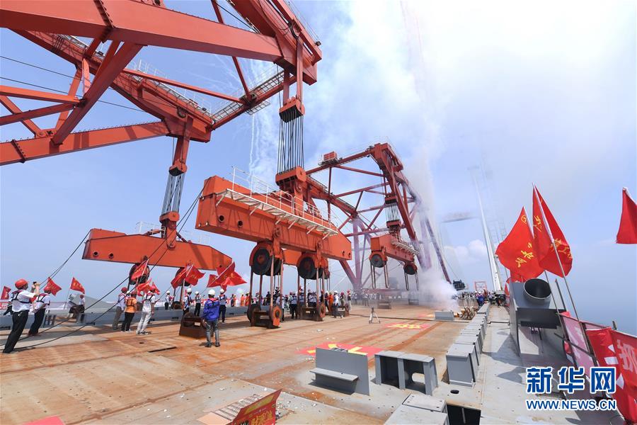福平鐵路平潭海峽公鐵兩用大橋元洪航道橋主橋成功合龍現場(6月5日攝)。