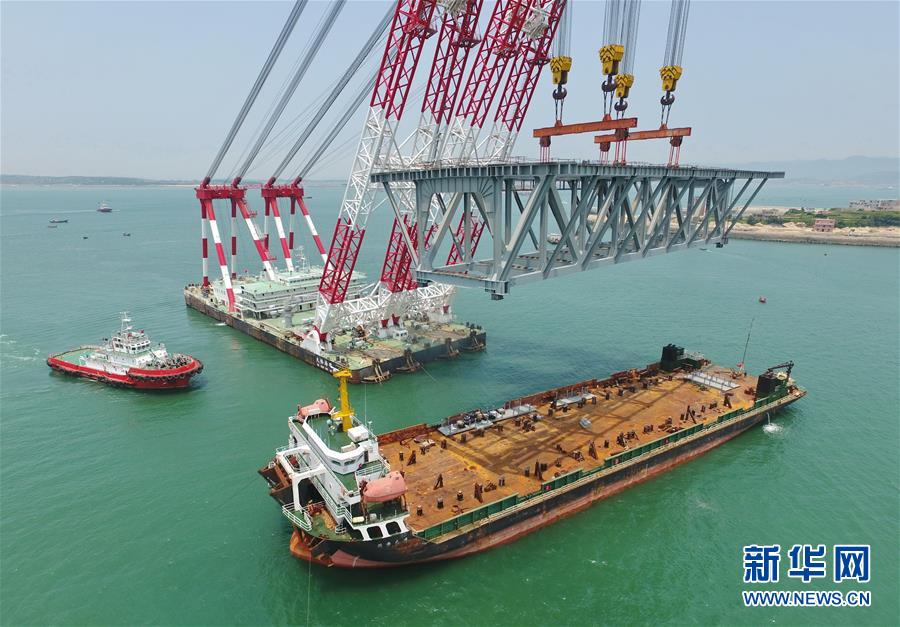 5月12日,“大橋海鷗號”起重船在吊裝一孔簡支鋼桁梁(無人機拍攝)。新華社記者 林善傳 攝