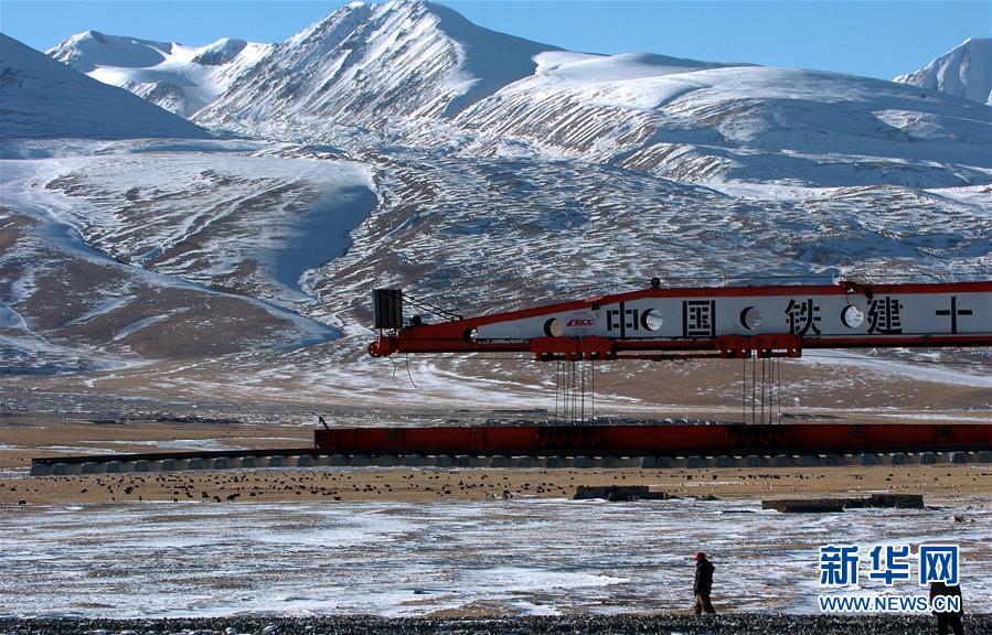 青藏鐵路在架橋施工中(2004年資料照片)。新華社記者覺(jué)果攝