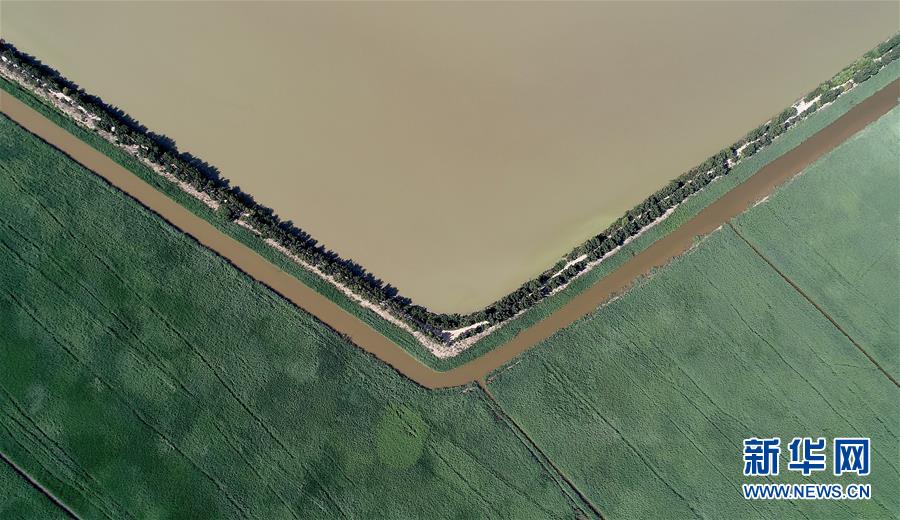 這是天津市寧河區(qū)七里海濕地內(nèi)蘆葦和水面形成的圖案(6月22日無人機(jī)拍攝)。