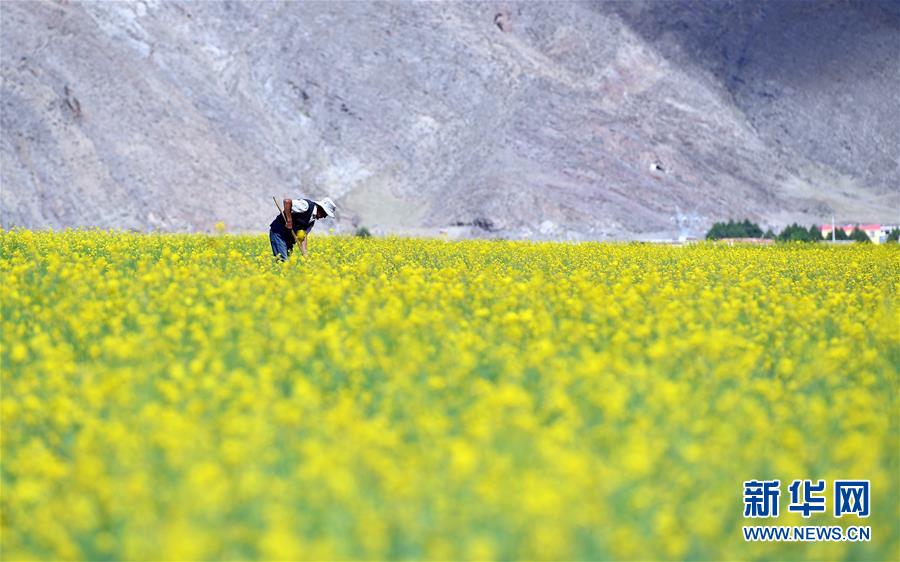 7月2日,拉薩市堆龍德慶區(qū)德慶鄉(xiāng)的村民在打理油菜花田。 近日,西藏各地的油菜花盛開,呈現(xiàn)出生機勃勃的夏日美景。 新華社記者 李鑫 攝