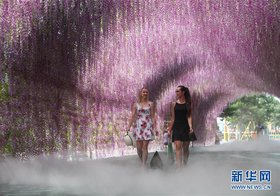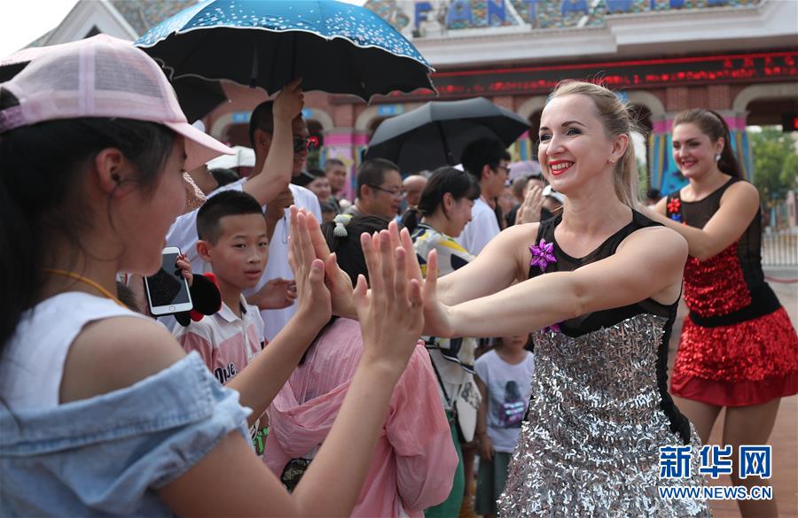 7月31日,列娜(前排左)在沈陽(yáng)方特歡樂(lè)世界門(mén)前表演舞蹈。