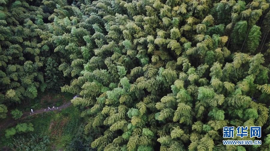 8月3日,游客行走在木坑竹海景區(qū)的小路上(無人機拍攝)。夏日,安徽省黃山市黟縣的木坑竹海景區(qū)風景優(yōu)美,吸引不少游客前來休閑避暑。新華社記者張端攝