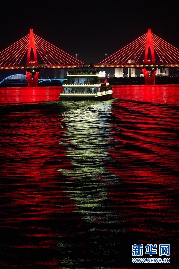 這是江西南昌贛江畔的燈光秀(8月6日攝)。  新華社記者周密 攝