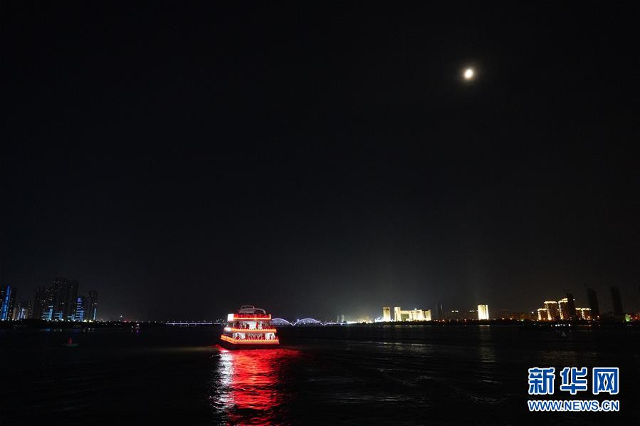 在江西南昌,游客在游輪上觀賞夜景(8月6日攝)。  新華社記者萬象 攝