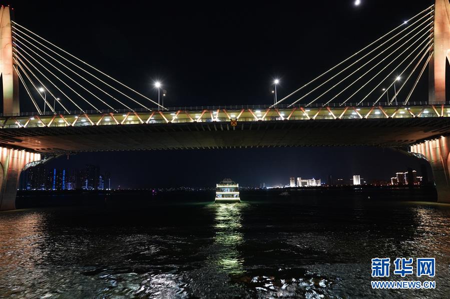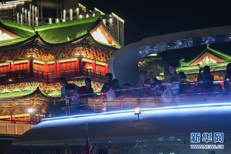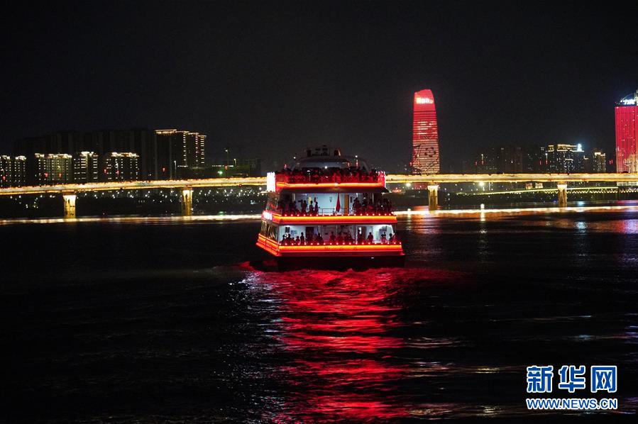 在江西南昌,游客在游輪上觀賞夜景風(fēng)光(8月6日攝)。 新華社記者萬象 攝