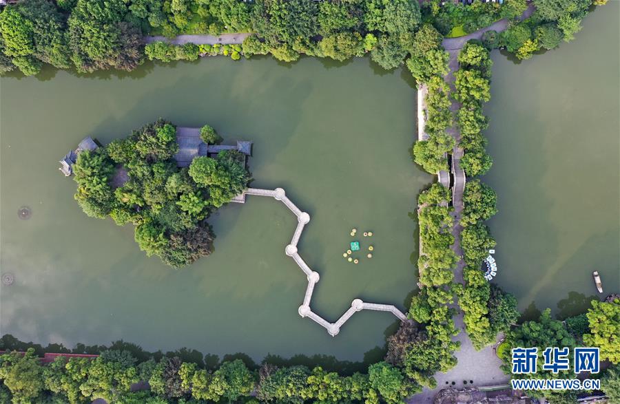 桂林市榕湖上的橋梁(7月1日無人機拍攝)。 夏日時節(jié),廣西桂林市區(qū)內的榕湖、杉湖、桂湖、木龍湖等地綠樹成蔭、景色迷人。 新華社記者陸波岸攝
