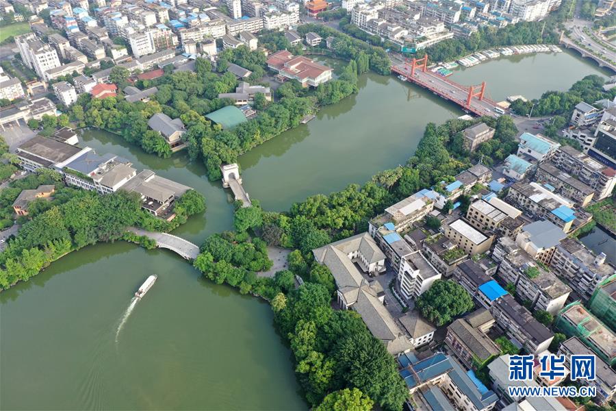 桂林市榕湖附近景觀(7月1日無人機拍攝)。 夏日時節(jié),廣西桂林市區(qū)內的榕湖、杉湖、桂湖、木龍湖等地綠樹成蔭、景色迷人。 新華社記者陸波岸攝