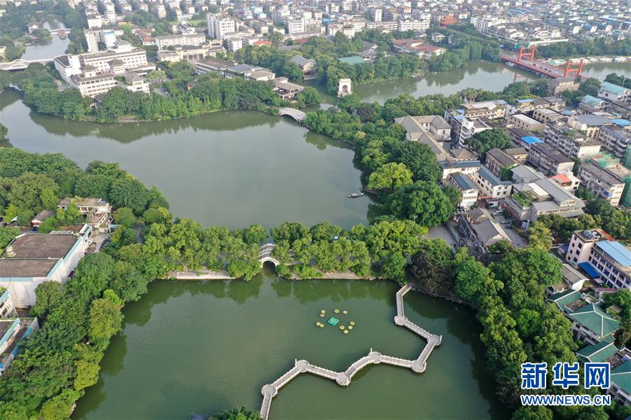 桂林市榕湖附近景觀(7月1日無人機(jī)拍攝)。 夏日時(shí)節(jié),廣西桂林市區(qū)內(nèi)的榕湖、杉湖、桂湖、木龍湖等地綠樹成蔭、景色迷人。 新華社記者陸波岸攝