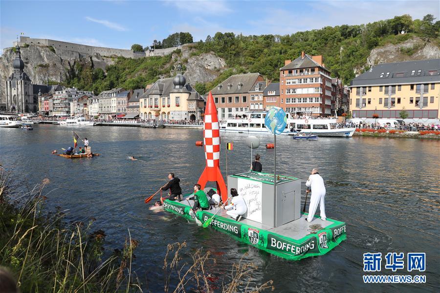 8月15日,在比利時(shí)南部小城迪南的默茲河上,人們參加“浴缸劃船節(jié)”的表演。新華社記者 張鋮 攝