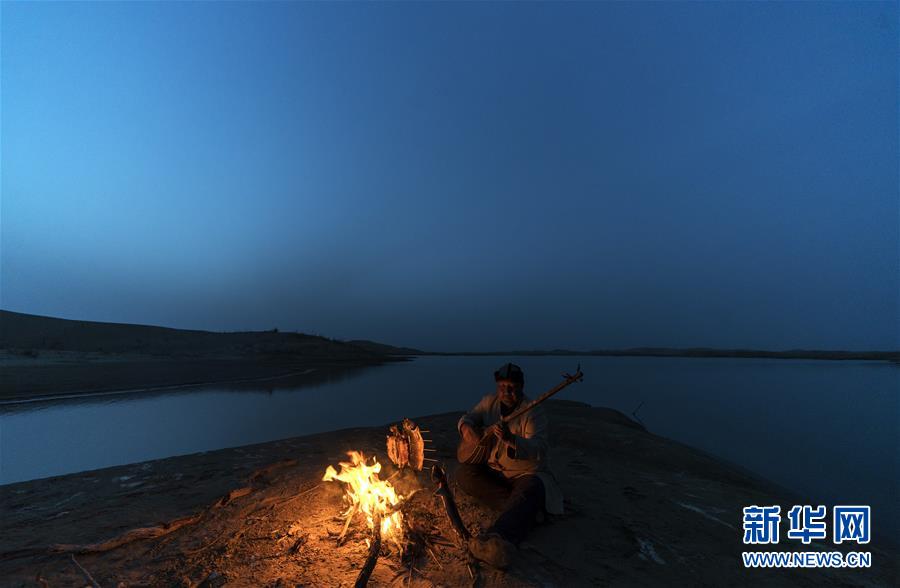 在羅布人村寨,阿木東·艾不東在沙漠里的一處海子旁彈奏樂(lè)器,等待烤魚(yú)烤熟(4月11日攝)。新華社記者 費(fèi)茂華 攝