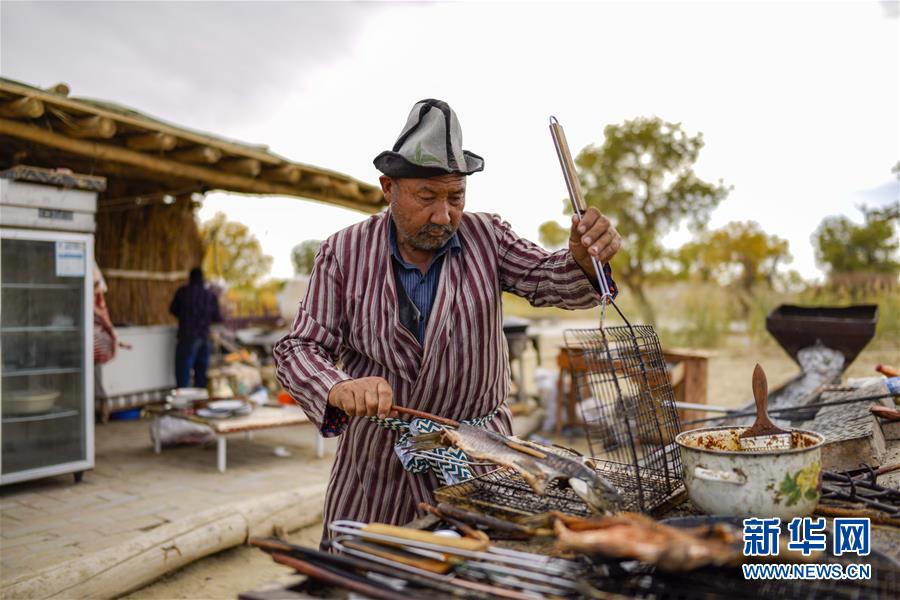 在羅布人村寨,阿木東·艾不東在家中制作羅布烤魚(yú)(2018年10月16日攝)。新華社記者 趙戈 攝