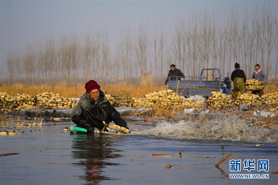 1月31日,在雄安新區(qū)安新縣東向陽村的一處藕塘,一名挖藕工在水里工作。新華社記者沈伯韓攝