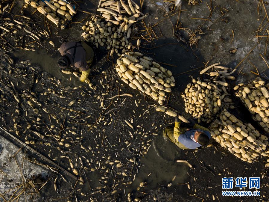 1月31日,在雄安新區(qū)安新縣東向陽村的一處藕塘,挖藕工清洗挖出來的藕(無人機(jī)航拍)。新華社記者沈伯韓攝