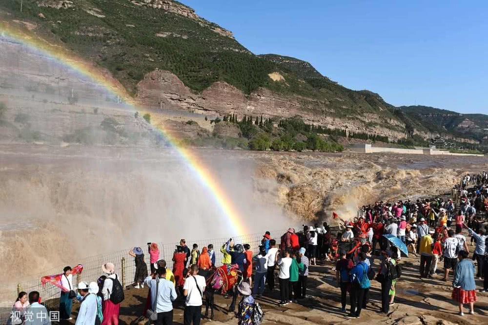 入秋以來(lái),山西吉縣黃河壺口瀑布景區(qū)天氣晴好,黃河干流水量豐沛,壺口瀑布飛濺的浪花和水霧在陽(yáng)光的照射下,形成“彩虹門”景觀,吸引了眾多游客。
