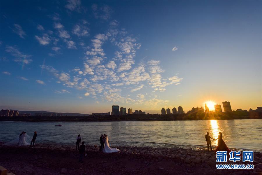 新人們在云南省景洪市瀾滄江邊拍婚紗照(2018年11月29日攝)。 新華社記者江文耀攝