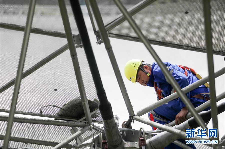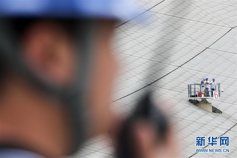 8月28日,工作人員在對(duì)FAST進(jìn)行檢修。 近日,工作人員對(duì)“中國(guó)天眼”進(jìn)行日常維護(hù)和檢修,給 “天眼”進(jìn)行全面“體檢”。被譽(yù)為“中國(guó)天眼”的500米口徑球面射電望遠(yuǎn)鏡(FAST)于2016年9月25日落成啟用,即將迎來(lái)落成三周年。 新華社記者 歐東衢 攝