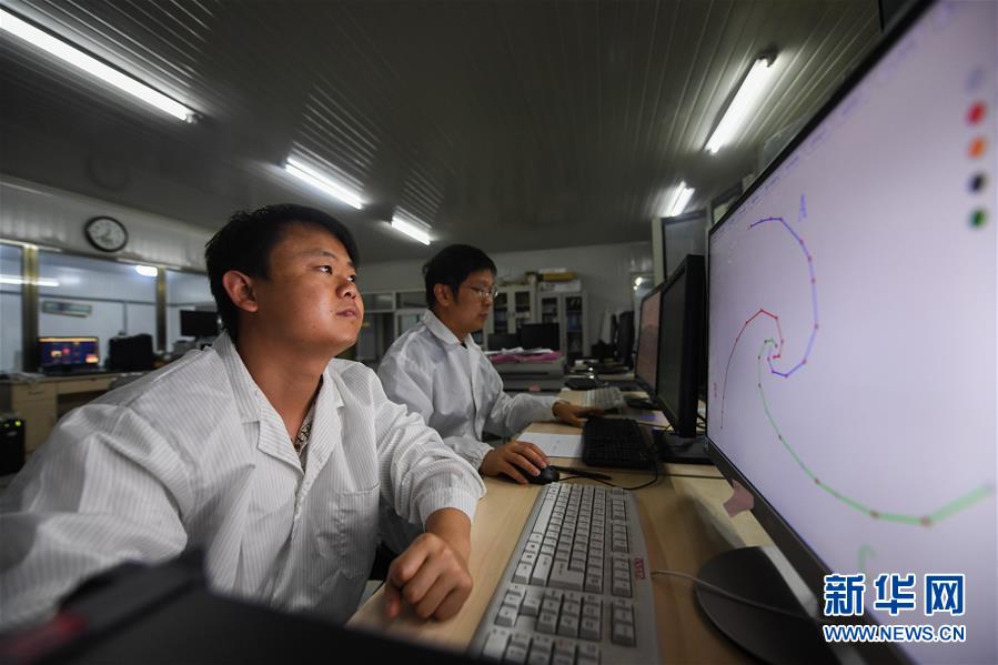 在明安圖觀測(cè)基地,科研人員周志超(前)和譚程明在觀測(cè)室內(nèi)工作(7月27日攝)。 新華社記者 劉磊 攝