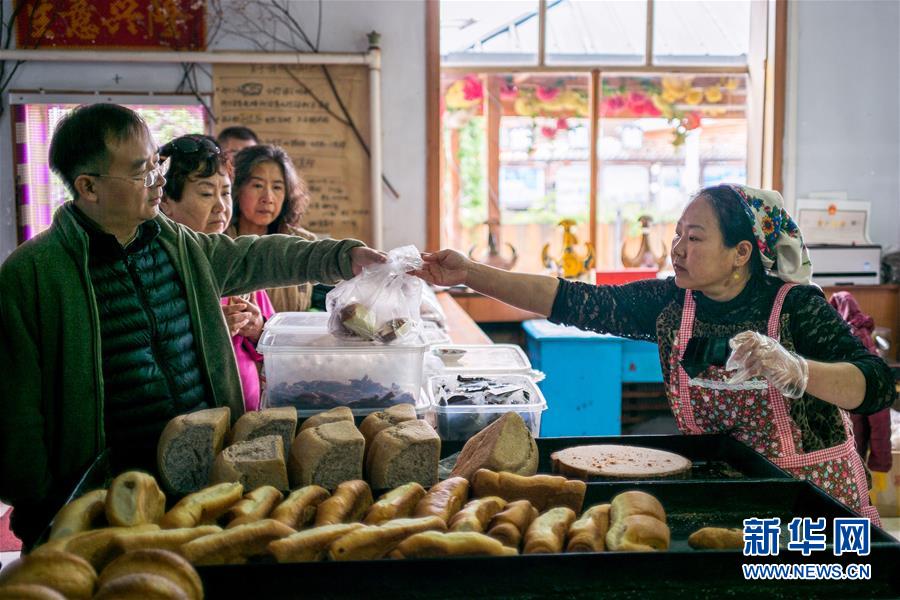 8月27日,游客在付艷梅的列巴房?jī)?nèi)買面包。新華社記者張豪夫攝