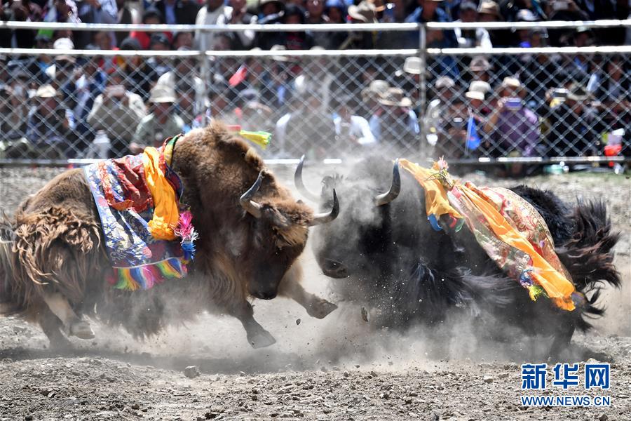者下鄉(xiāng)斗牛節(jié)歷史悠久,是西藏自治區(qū)非物質(zhì)文化遺產(chǎn)。牧民為參加比賽的種牦牛披綢掛緞,將牛群趕到位于日喀則市白朗縣者下鄉(xiāng)的斗牛場上。參賽的種牦牛為了爭奪牛群的控制權(quán),在成群的母牛面前,更加好斗。角斗有的瞬間分出勝負,有的持續(xù)幾十分鐘,最終勝出的被稱為“牦牛至尊”。