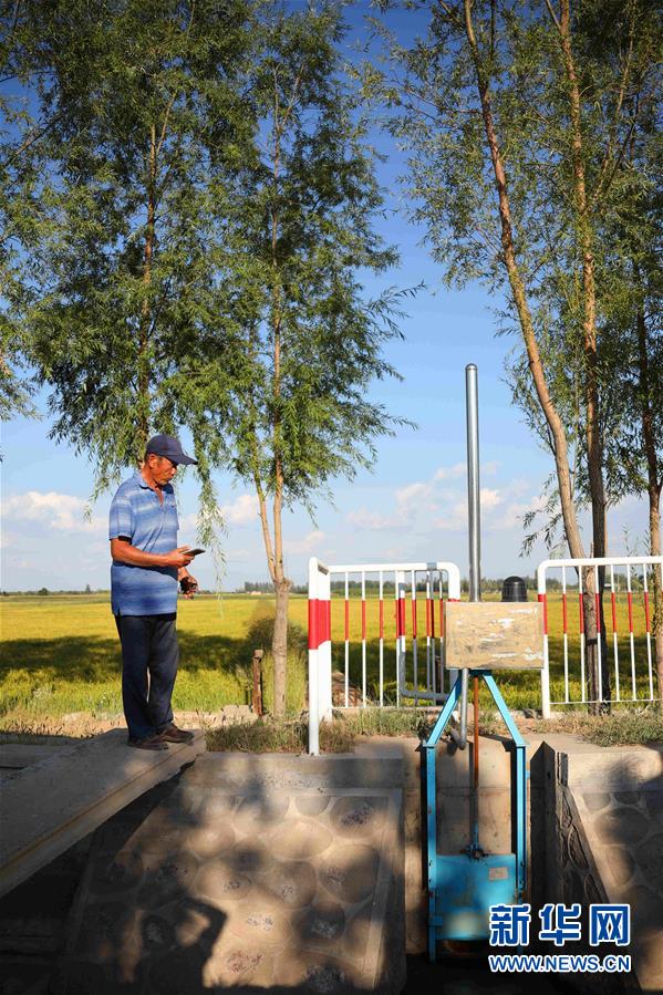 銀川市賀蘭縣常信鄉(xiāng)潭渠村村民用水協(xié)會(huì)會(huì)長(zhǎng)孫萬(wàn)銀輕點(diǎn)手機(jī),灌溉支渠上的水閘緩緩升起(9月1日攝)。新華社記者劉詩(shī)平攝