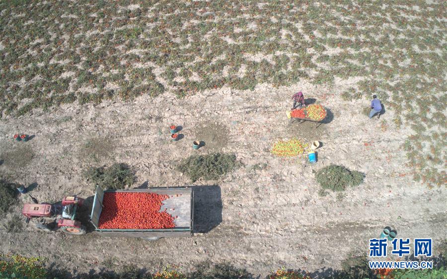 9月4日無人機拍攝的河套灌區(qū)友愛村四組村民仇漢強夫婦在收獲番茄。 新華社記者 劉詩平 攝