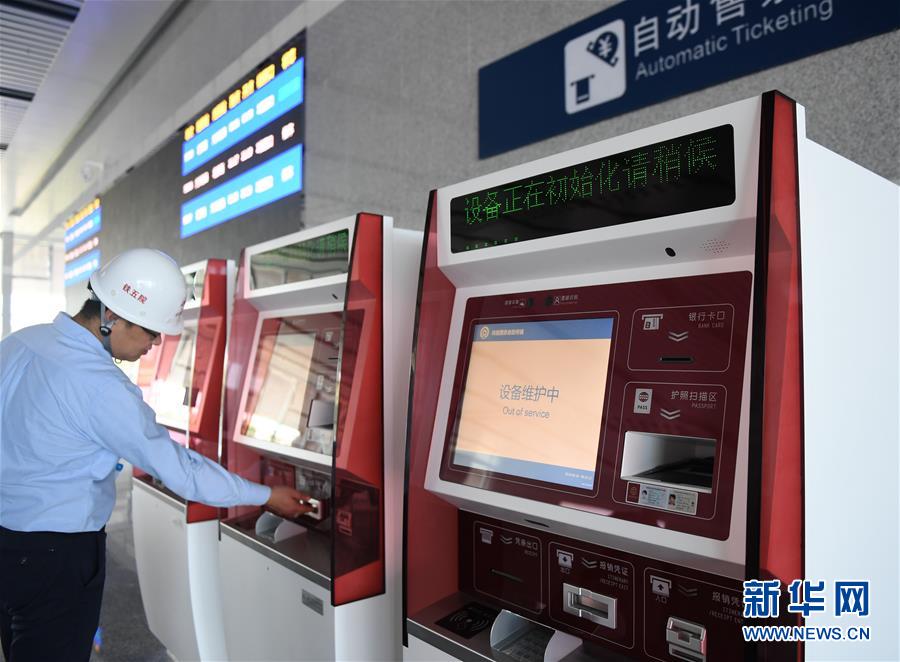 9月18日,工作人員對京雄城際北京大興站內(nèi)的自動售票機進(jìn)行檢查。新華社記者張晨霖攝