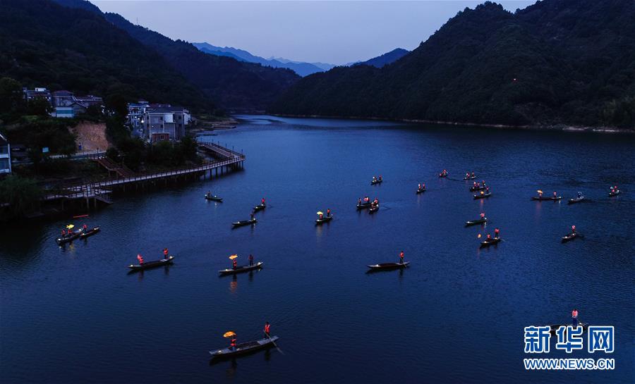 9月25日,在宋村鄉(xiāng)云源港的水面上,漁民劃著漁船,船頭點亮漁燈,構(gòu)成一幅“漁舟唱晚、萬家燈火”的美麗圖景(無人機拍攝)。 近年來,浙江省杭州市淳安縣宋村鄉(xiāng)積極發(fā)展鄉(xiāng)村旅游,打造漁家元素特色景觀,助力鄉(xiāng)村振興建設(shè)。目前,宋村鄉(xiāng)依托山水景觀和漁家文化,帶動了當(dāng)?shù)鼐访袼藓图碁╂宜⒆灾鸁?、農(nóng)事體驗、民俗攝影采風(fēng)為一體的特色旅游發(fā)展。2019年1月初至7月底,全鄉(xiāng)接待游客10萬人次,實現(xiàn)旅游經(jīng)濟收入1300萬元。 新華社記者 徐昱 攝