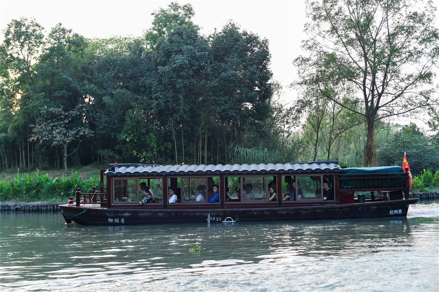 10月3日,游客在西溪國家濕地公園乘船游覽。 當(dāng)日是國慶假期第三天,大批游客來到位于杭州的西溪國家濕地公園游玩,在江南詩意的環(huán)境中休閑度假。 新華社記者 黃宗治 攝