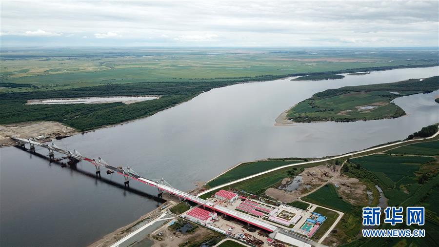 正在進行橋面鋪裝施工作業(yè)的黑河到布拉戈維申斯克黑龍江(阿穆爾河)大橋(8月19日無人機拍攝)。新華社記者 王建威 攝