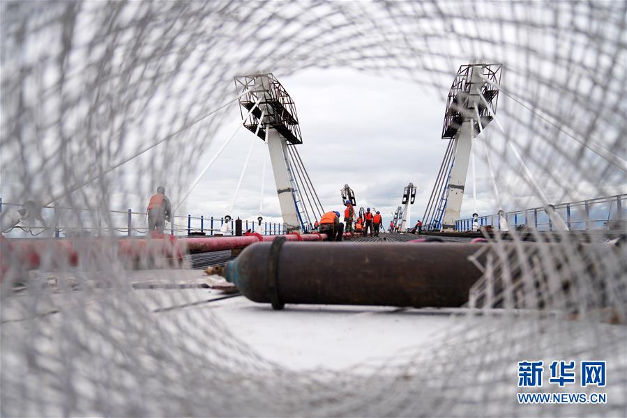 工人在大橋上進行橋面鋪裝施工作業(yè)(8月19日攝)。新華社記者 王建威 攝