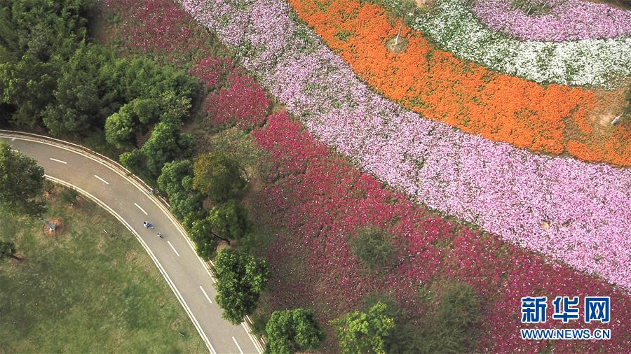 10月9日無人機拍攝的四季花海城市公園風(fēng)景。 秋日時節(jié),位于安徽省合肥市的四季花海城市公園花香四溢,色彩繽紛,成為游客和市民休閑游玩的好去處。 新華社記者 張端 攝