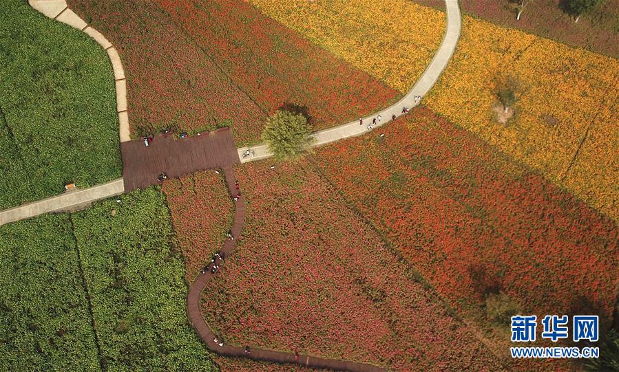 10月9日無人機拍攝的四季花海城市公園風(fēng)景。 秋日時節(jié),位于安徽省合肥市的四季花海城市公園花香四溢,色彩繽紛,成為游客和市民休閑游玩的好去處。 新華社記者 張端 攝