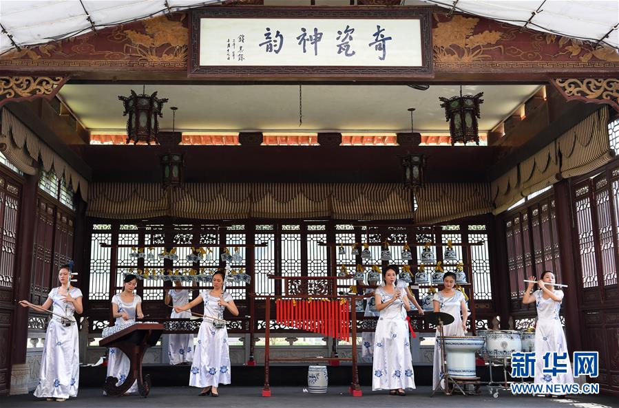 在江西景德鎮(zhèn)古窯民俗博覽區(qū),演員們用瓷制樂器進(jìn)行“瓷樂”表演(2018年9月20日攝)。新華社記者 萬(wàn)象 攝