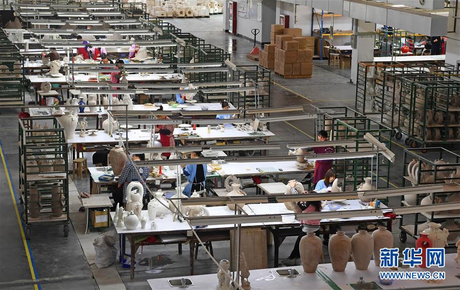 在江西景德鎮(zhèn)法藍(lán)瓷實(shí)業(yè)有限公司,工人們?cè)谔沾缮a(chǎn)車間工作(2017年4月8日攝)。新華社記者 萬(wàn)象 攝