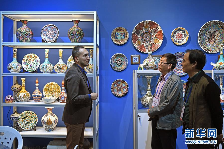 在中國(guó)景德鎮(zhèn)國(guó)際陶瓷博覽會(huì)的現(xiàn)場(chǎng),來自土耳其的參展商(左一)與參觀者交流(2018年10月18日攝)。新華社記者 萬(wàn)象 攝