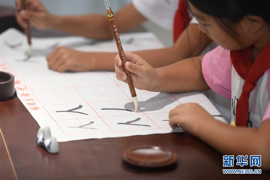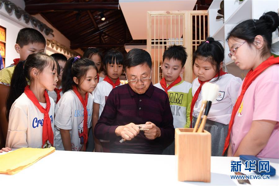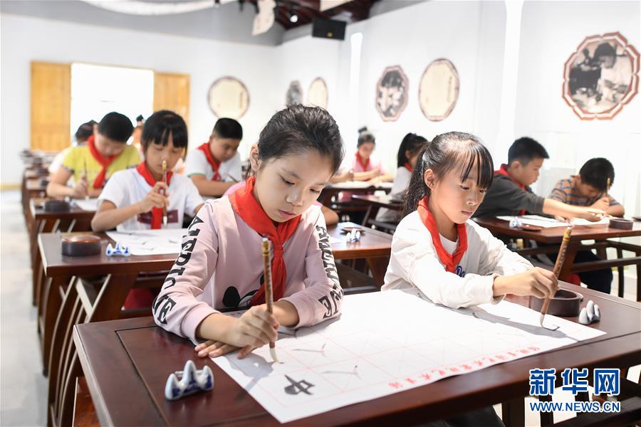 10月14日,小學(xué)生在非遺活態(tài)傳承館使用湖筆練習(xí)書法。 新華社記者 黃宗治 攝