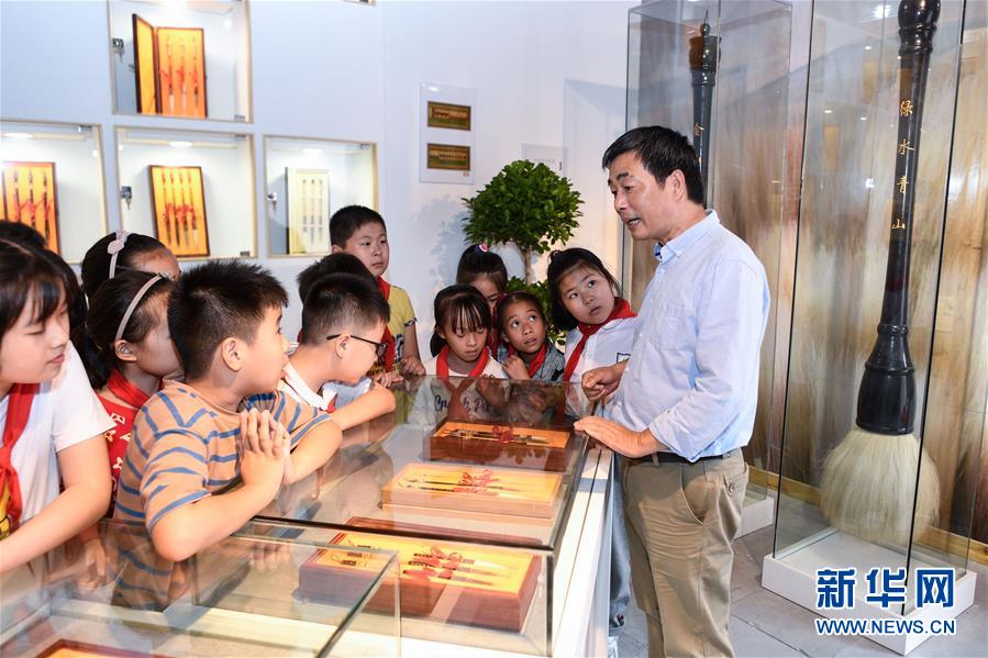 10月14日,小學(xué)生在非遺活態(tài)傳承館觀看湖筆的實物展示。新華社記者 黃宗治 攝