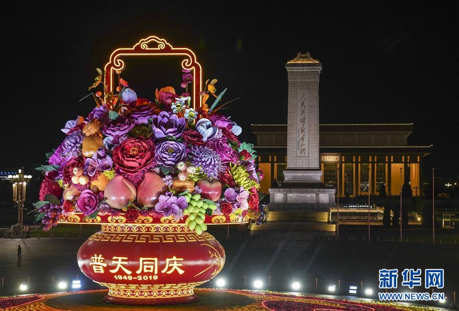 這是10月14日拍攝的天安門廣場中心花壇。 10月14日,以“花果籃”為主造型的天安門廣場中心花壇吸引了眾多游客參觀拍照?!盎ü@”的夜景更是流光溢彩,絢爛迷人。 新華社記者 殷剛 攝