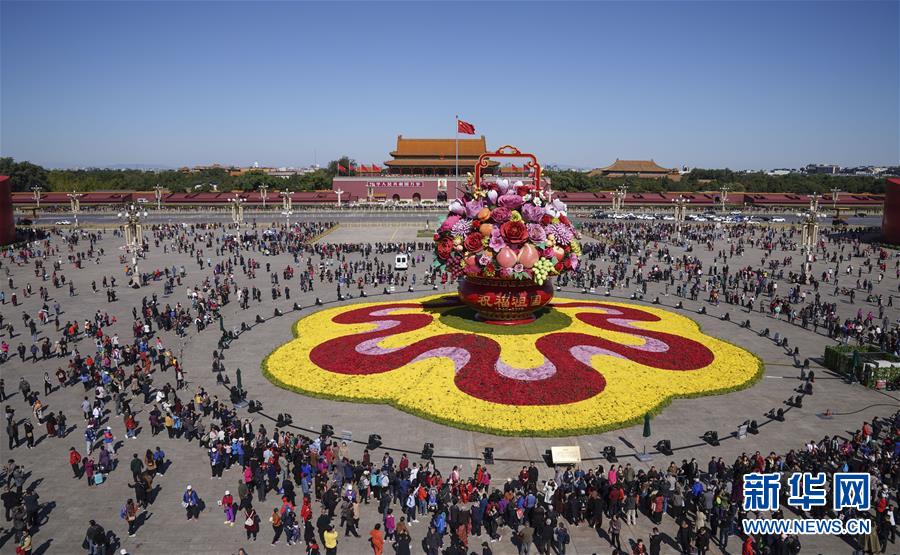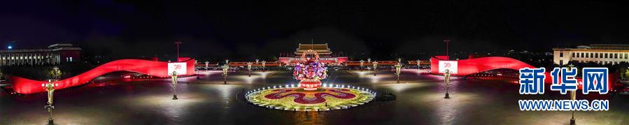 這是10月14日拍攝的天安門廣場中心花壇(全景拼接圖片)。 10月14日,以“花果籃”為主造型的天安門廣場中心花壇吸引了眾多游客參觀拍照。“花果籃”的夜景更是流光溢彩,絢爛迷人。 新華社記者 殷剛 攝