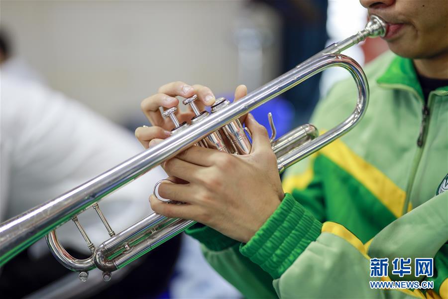 重慶市特殊教育中心排練廳,學(xué)生在排練開始前練習(xí)小號(hào)(10月9日攝)。 新華社記者 劉潺 攝
